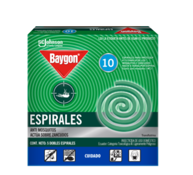 Los espirales Baygon Anti Mosquitos están diseñados para brindar protección efectiva contra zancudos mediante la liberación de un humo insecticida al encenderse. Cada espiral actúa de forma continua, ayudando a reducir la presencia de mosquitos en áreas abiertas o ventiladas.